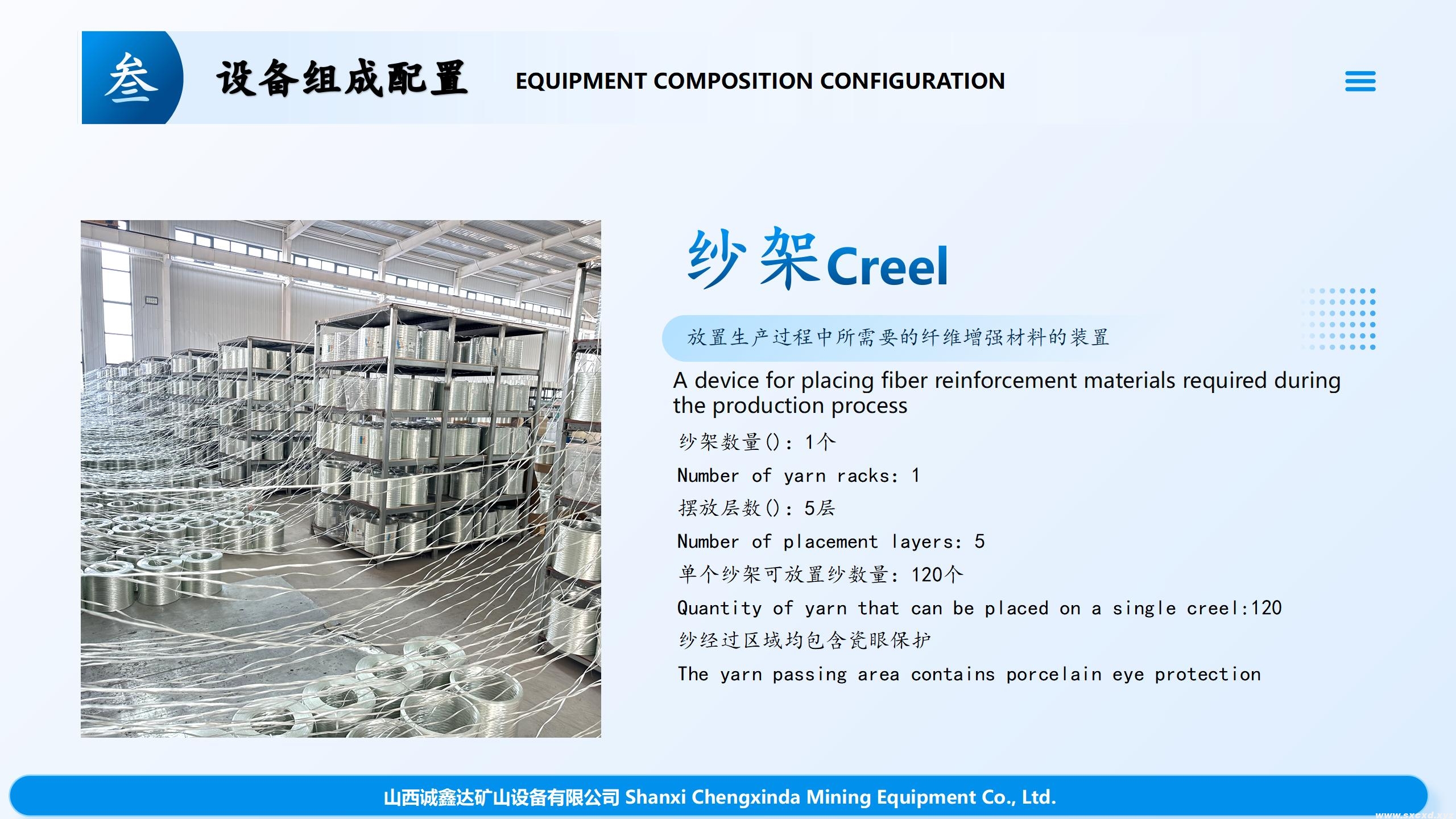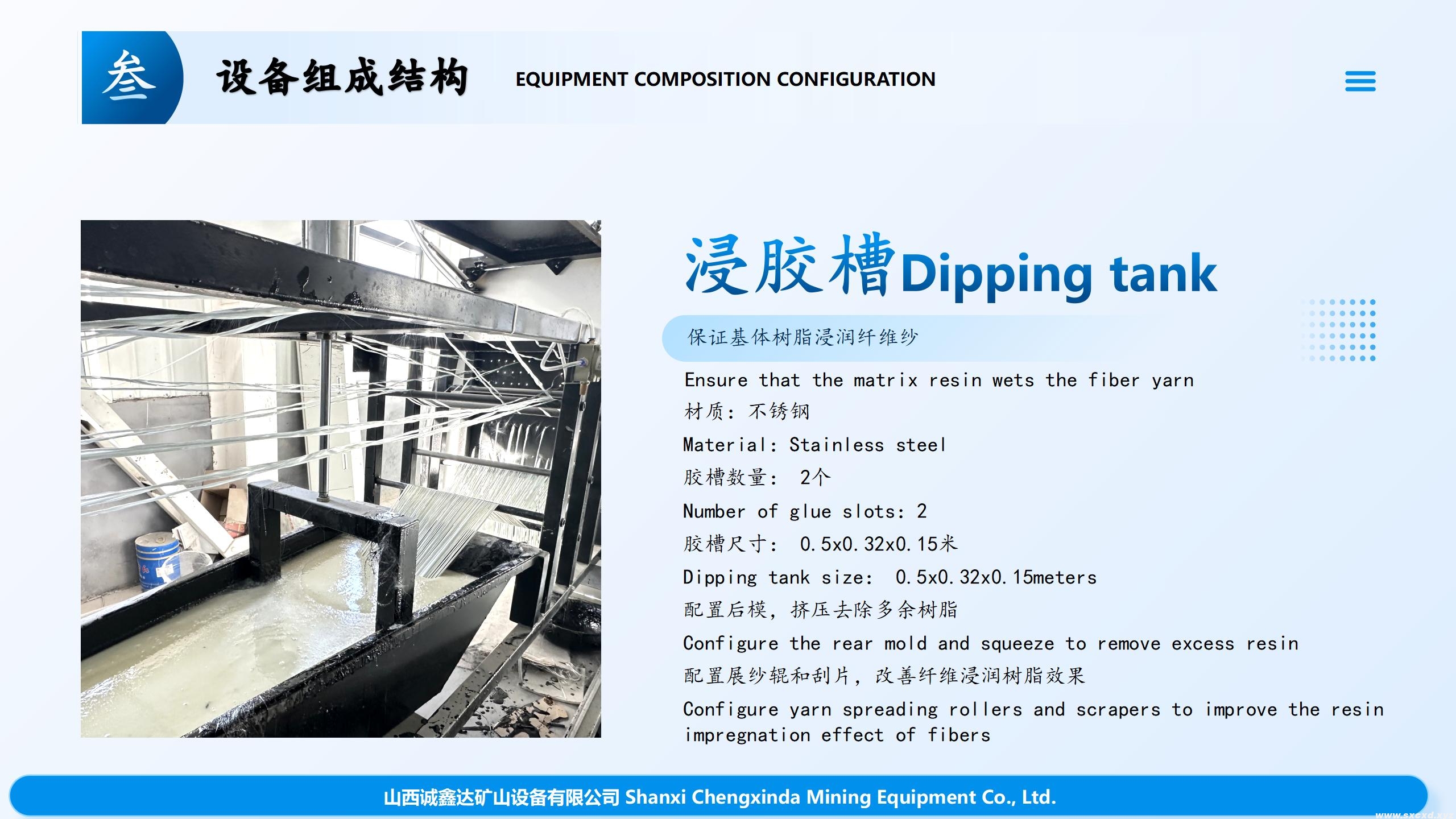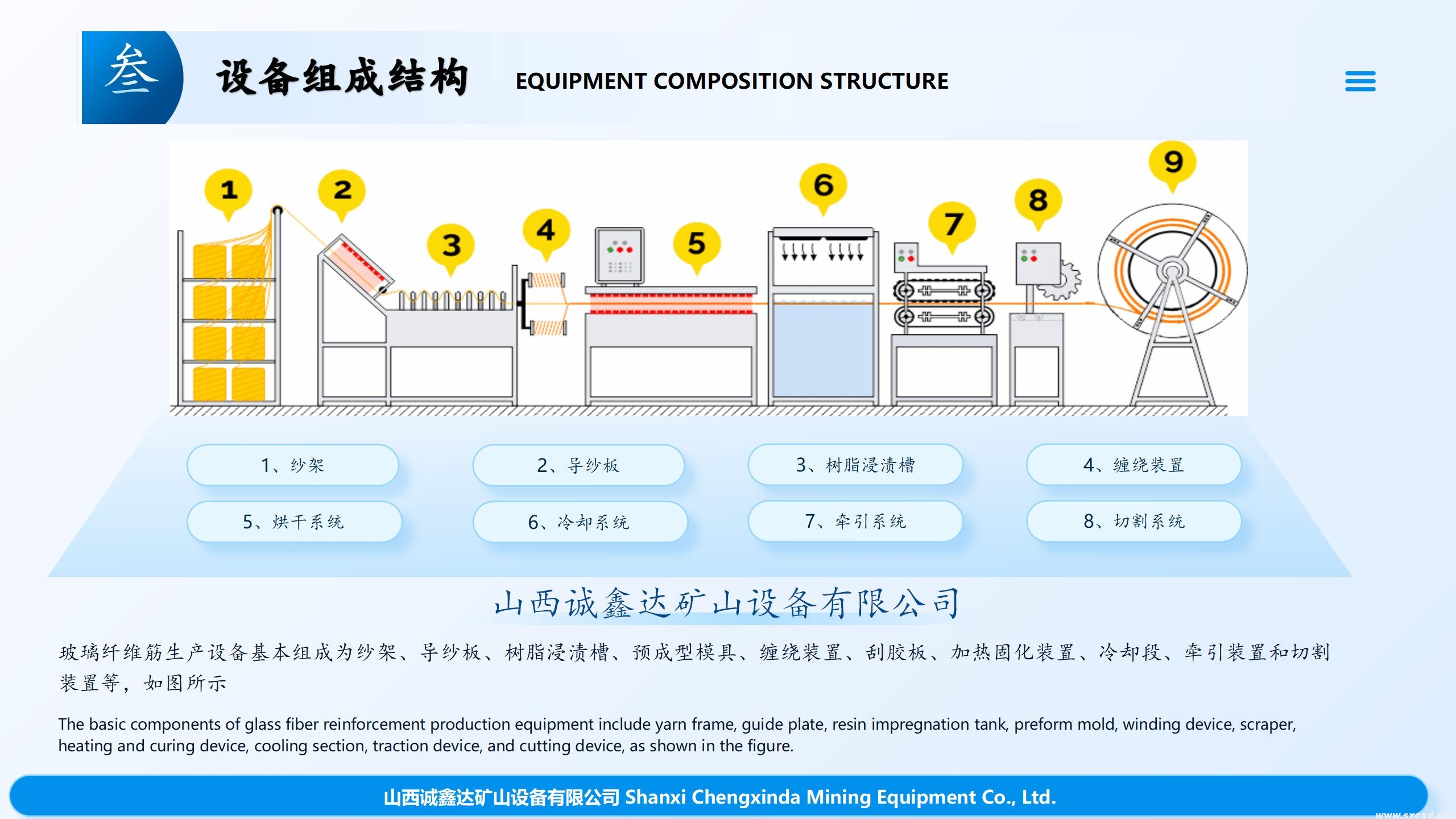 放在紗架上的玻璃纖維紗由于尾部牽引系統(tǒng)的作用,通過過絲板,送到了浸料槽,進料槽內(nèi)有樹脂,玻璃纖維紗在進料槽內(nèi)浸滿了樹脂,然后在通過預成型系統(tǒng)合攏成束,在模具內(nèi)經(jīng)過加熱器加熱熔融,通過液壓系統(tǒng)擠壓成型,在通過纏繞系統(tǒng),成為全螺紋玻璃纖維塑料杠體,(在進料槽、預成型系統(tǒng)、纏繞系統(tǒng)前端有硅膠片,作用是保證桿體光滑,無氣泡)然后進入烘干系統(tǒng)進行固化,經(jīng)過切割組件將桿體切割成所需要的長度,經(jīng)過品管員的檢驗,入庫。