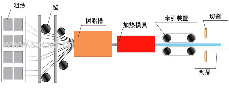 主要成型設(shè)備有紗架、膠槽、模具、牽引機、型材切割機等,輔助設(shè)備有烘干機、攪拌機、切氈機等。在成型過程中,每道工序都可以有不同方法:如送紗工序,可以增加連續(xù)纖維氈或三向織物以提高制品強度;牽引工序可以是履帶式牽引機,也可以是液壓式牽引機;固化方式可以是模內(nèi)固化,也可以用加熱爐固化;加熱方式可以是高頻電加熱或是熔融金屬等。