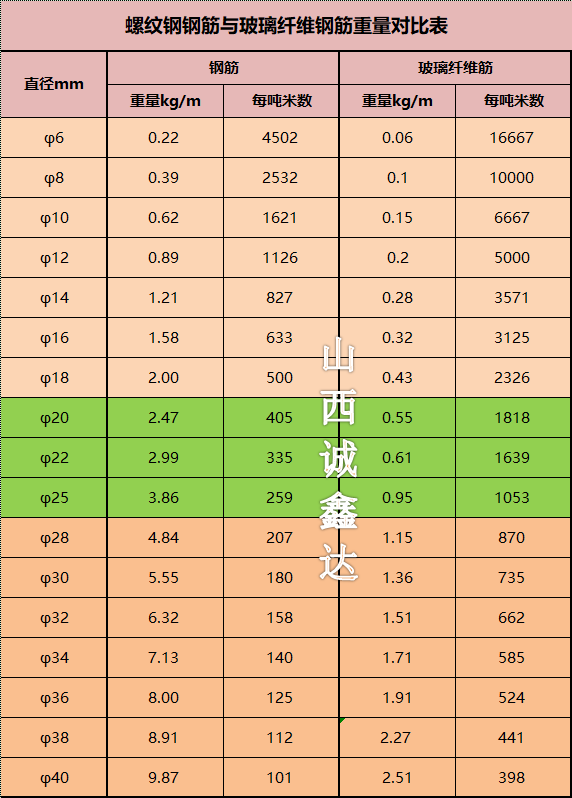 玻璃纖維筋和螺紋鋼筋重量對比表