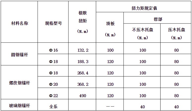 (一)表中扭力矩規(guī)定值為要求支護(hù)質(zhì)量的數(shù)值,各礦可根據(jù)礦內(nèi)實(shí)際情況對(duì)錨桿扭力矩值做適當(dāng)調(diào)整,但不得低于此表規(guī)定的數(shù)值。